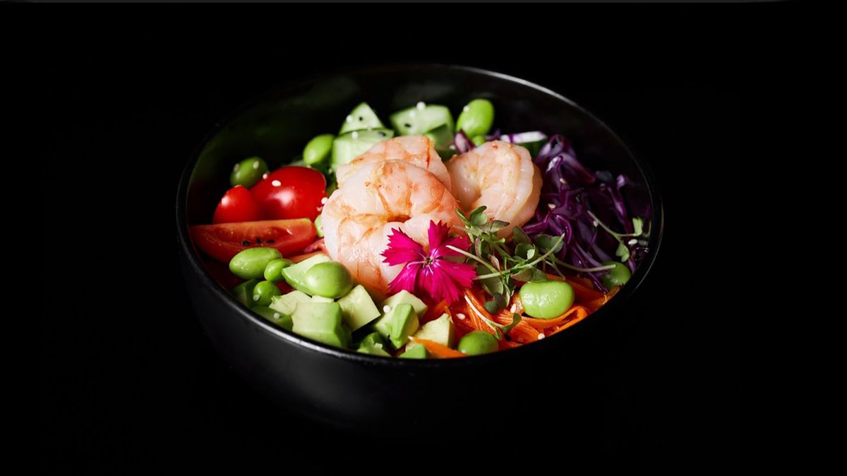 Rice, shrimps avocado, cucumber , red choux salad, Korean salad, Wakame salad Cherry tomatoes, edamame beans, teriyaki sauce, sesame seeds