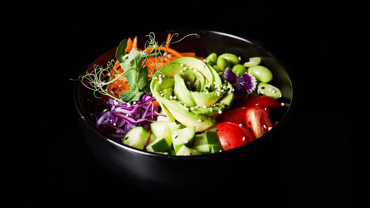 Rice, avocado, cucumber , red choux salad, Korean salad, Wakame salad Cherry tomatoes, edamame beans, sesame seeds