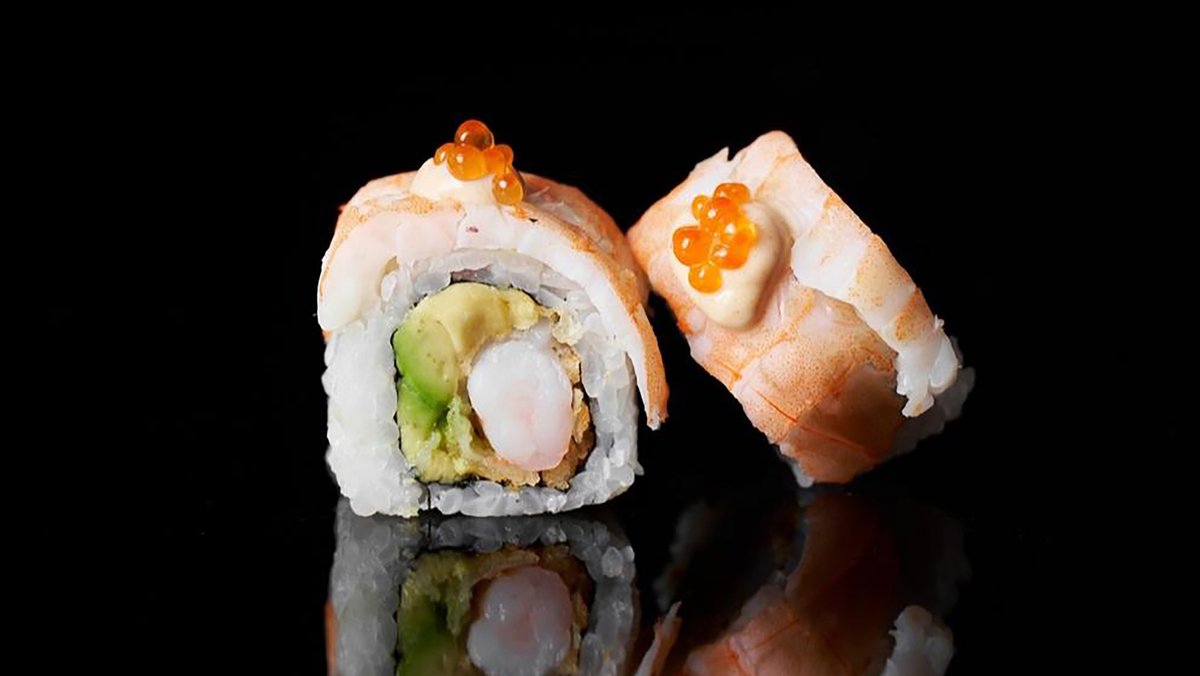 Nori, rice, tempura shrimp, avocado, ebi shrimp, salmon caviar, spicy sauce
