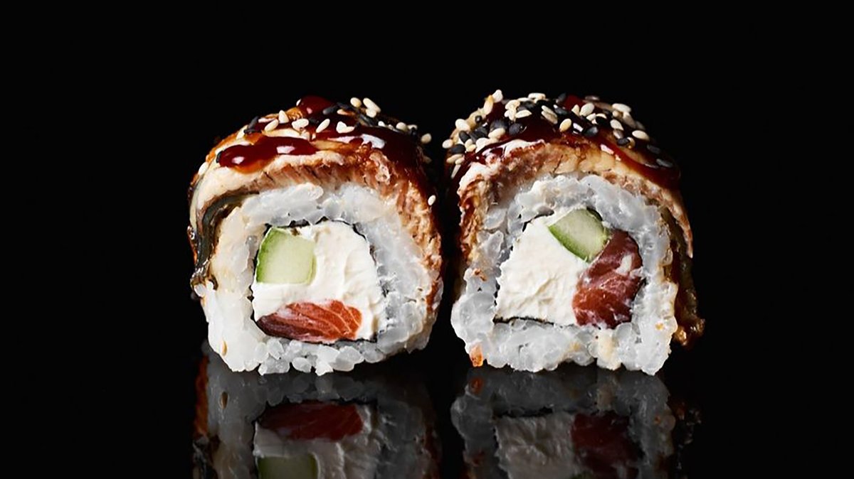 Nori, rice, eel unagi, avocado, cucumber, Philadelphia cheese, teriyaki sauce, spicy sauce, sesame seeds