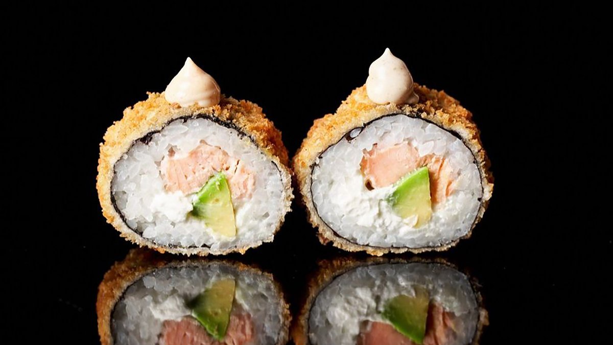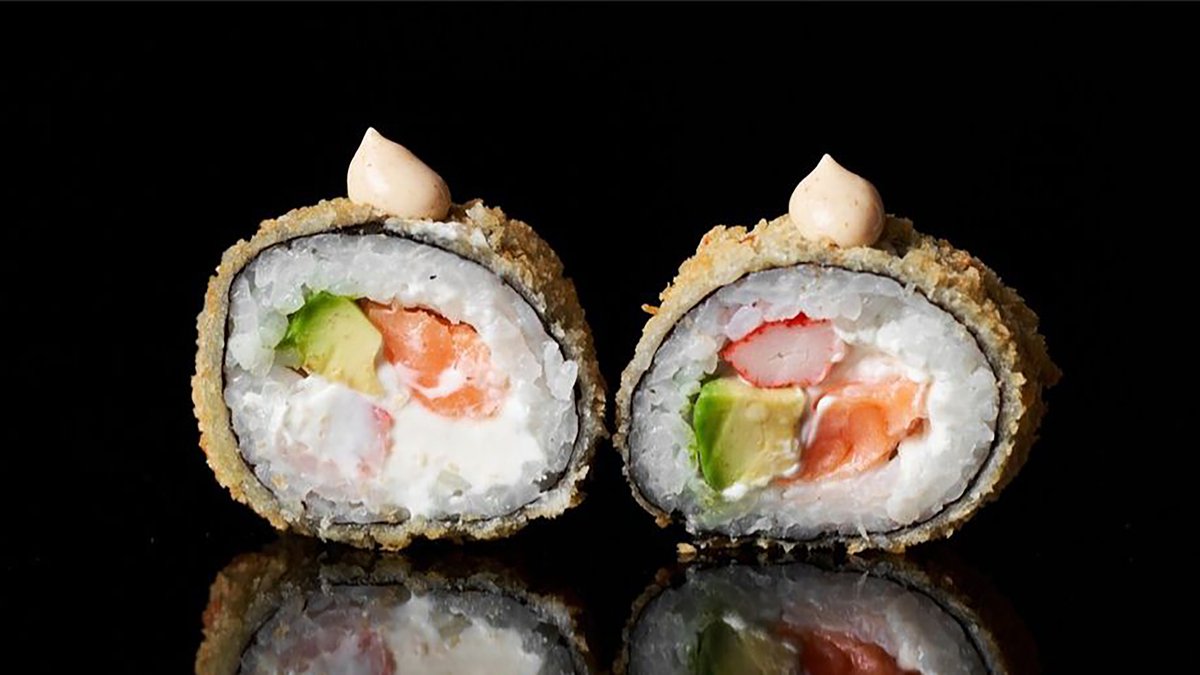 Nori, rice, tempura shrimp, Philadelphia cheese, mango, red tobico, spicy sauce