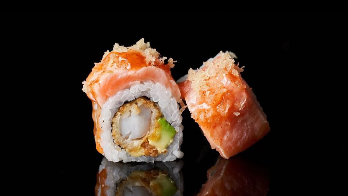 Nori, rice, tempura shrimp, salmon tataki ,avocado, spicy sauce, Norway sauce, tobico red, Tanuki