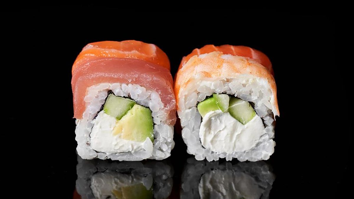 Nori, rice, salmon, tuna, ebi shrimp, avocado, cucumber, Philadelphia cheese