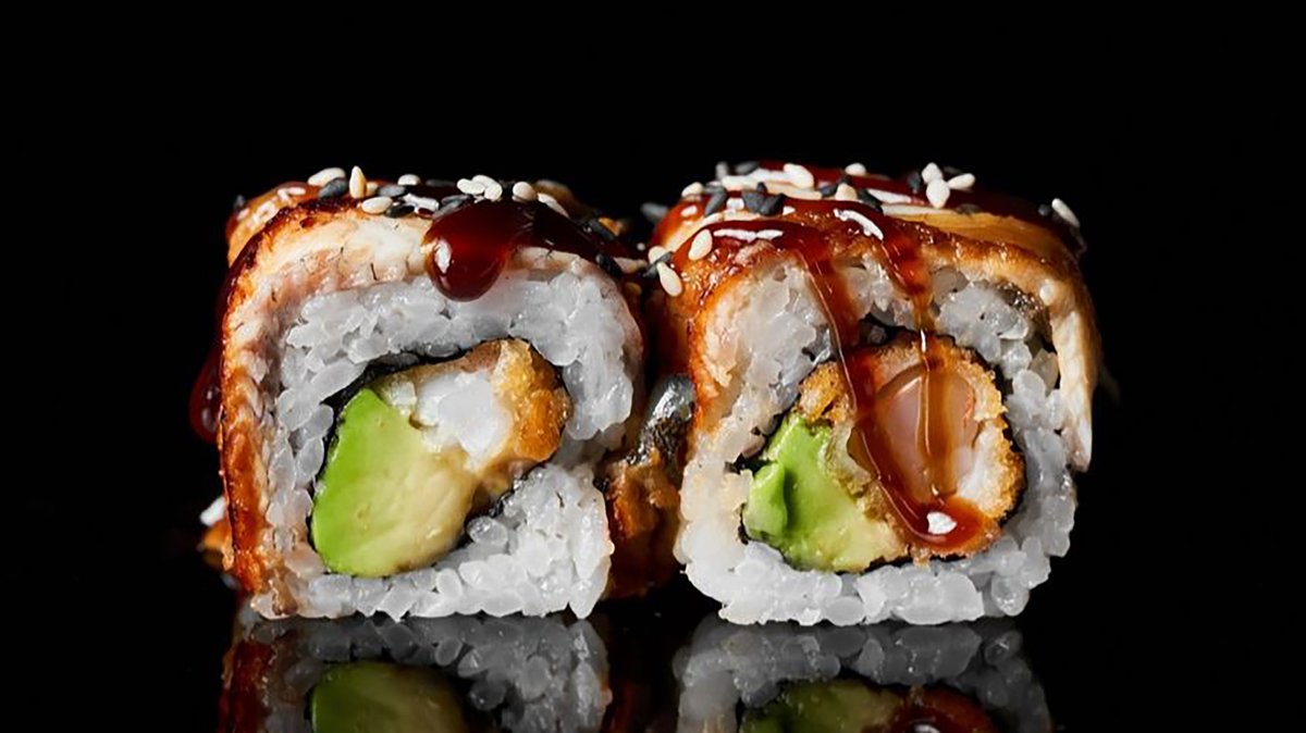 Nori, rice,tempura shrimp, avocado,Eel unagi, teriyaki sauce, spicy sauce, sesame seeds