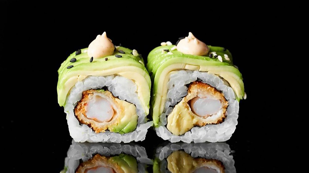 Nori, rice, tempura shrimp, avocado, spicy sauce, sesame seed