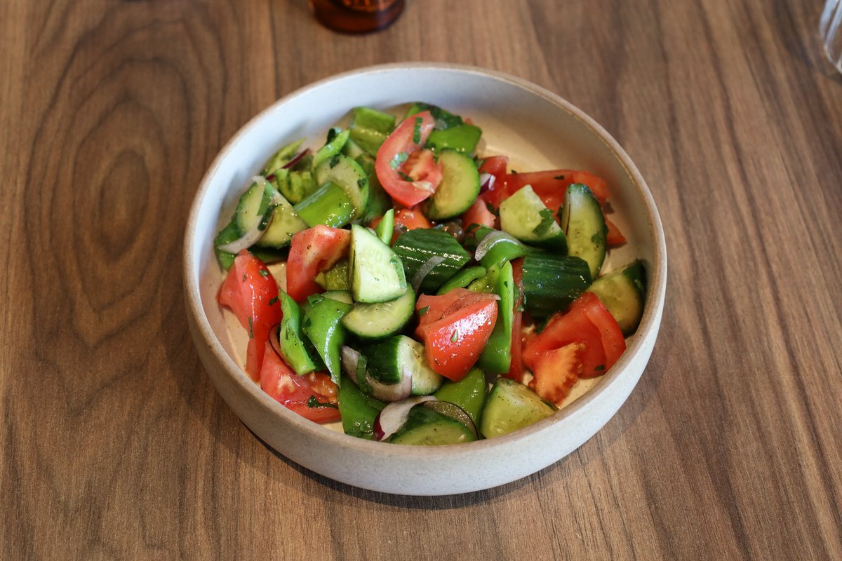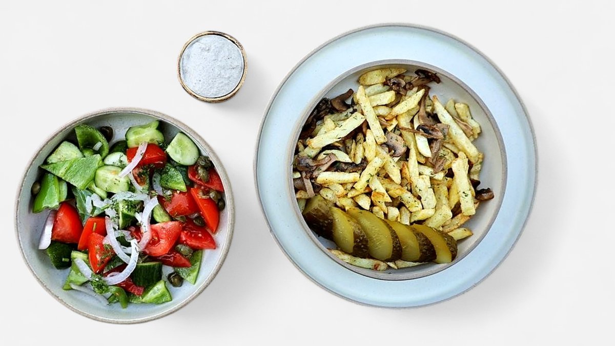FRIED POTATOES WITH MUSHROOMS & VEGETABLE SALAD