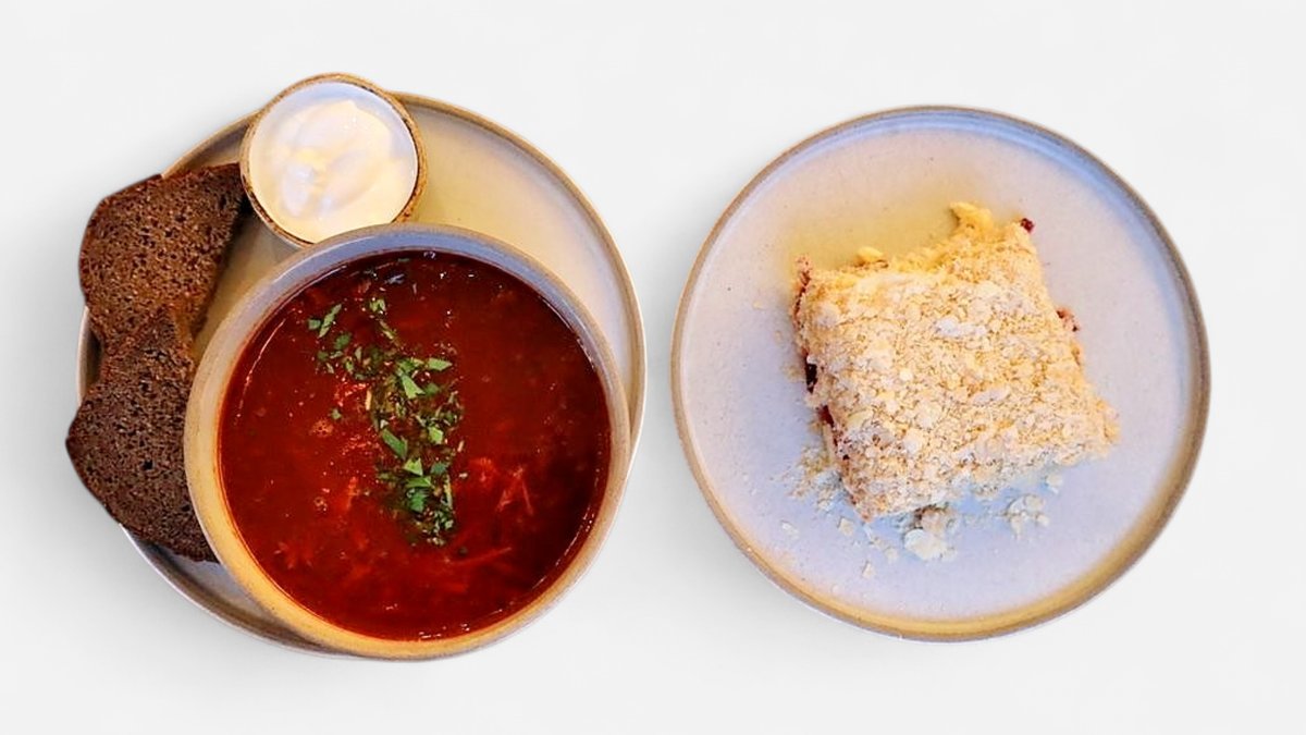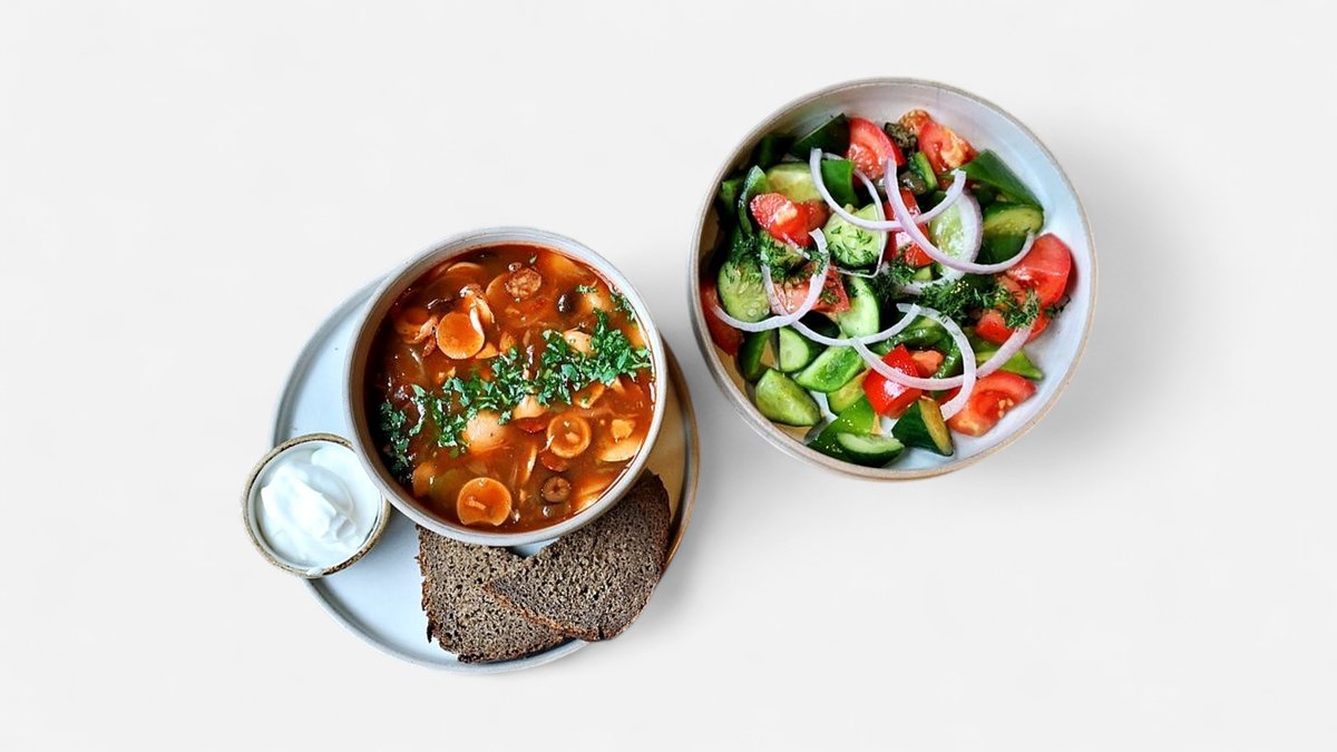Boiled beetroot/Boiled potatoes/Pickled cucumbers/Sauerkraut/Frozen green peas/Vegetable oil/Dill/Vinegar
