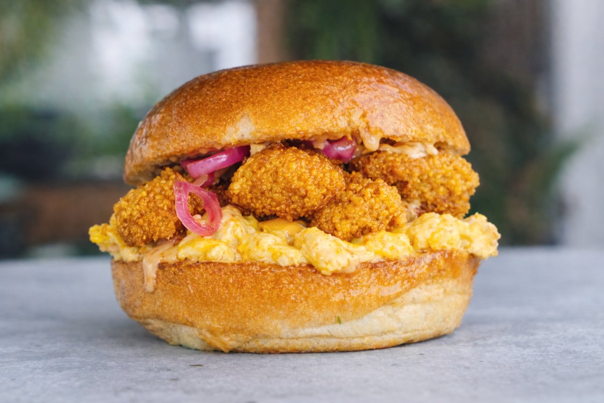 Brioche, scrambled eggs, chicken katsu, cheese, pickles, sweet chilli mayo