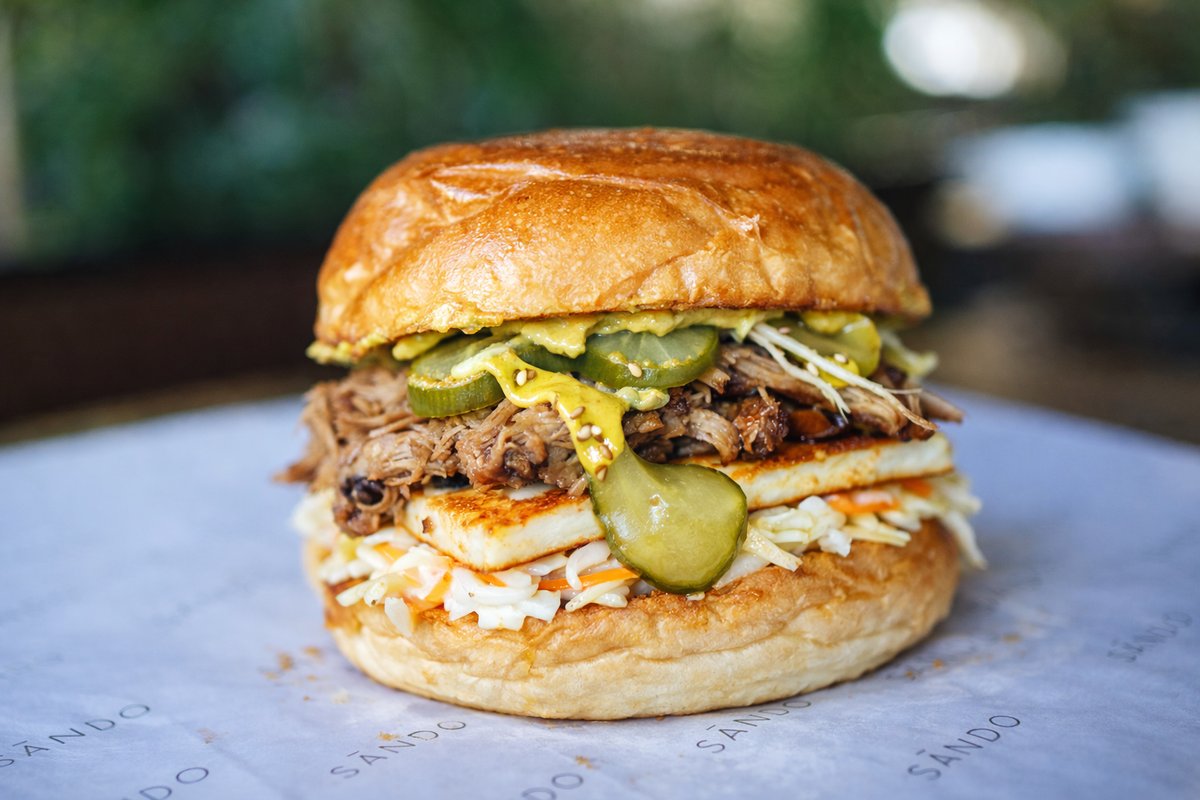 Brioche, 16 hour slow roasted pork, halloumi, homemade pickles, mustard, our house-slaw