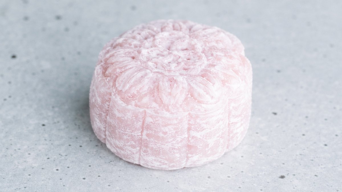 Snow skin mooncake with custard, naturally colored with beetroot juice