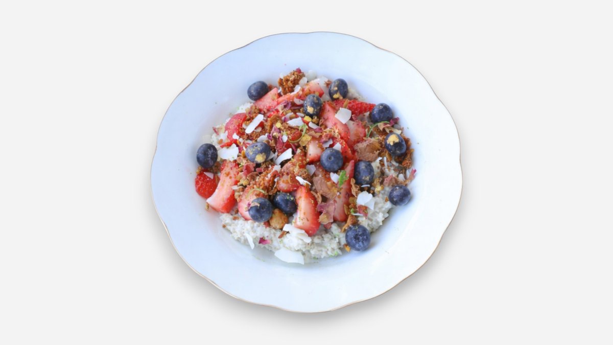 Soft yogurt topped with seasonal fruits, honey and our sugar free maple granola
