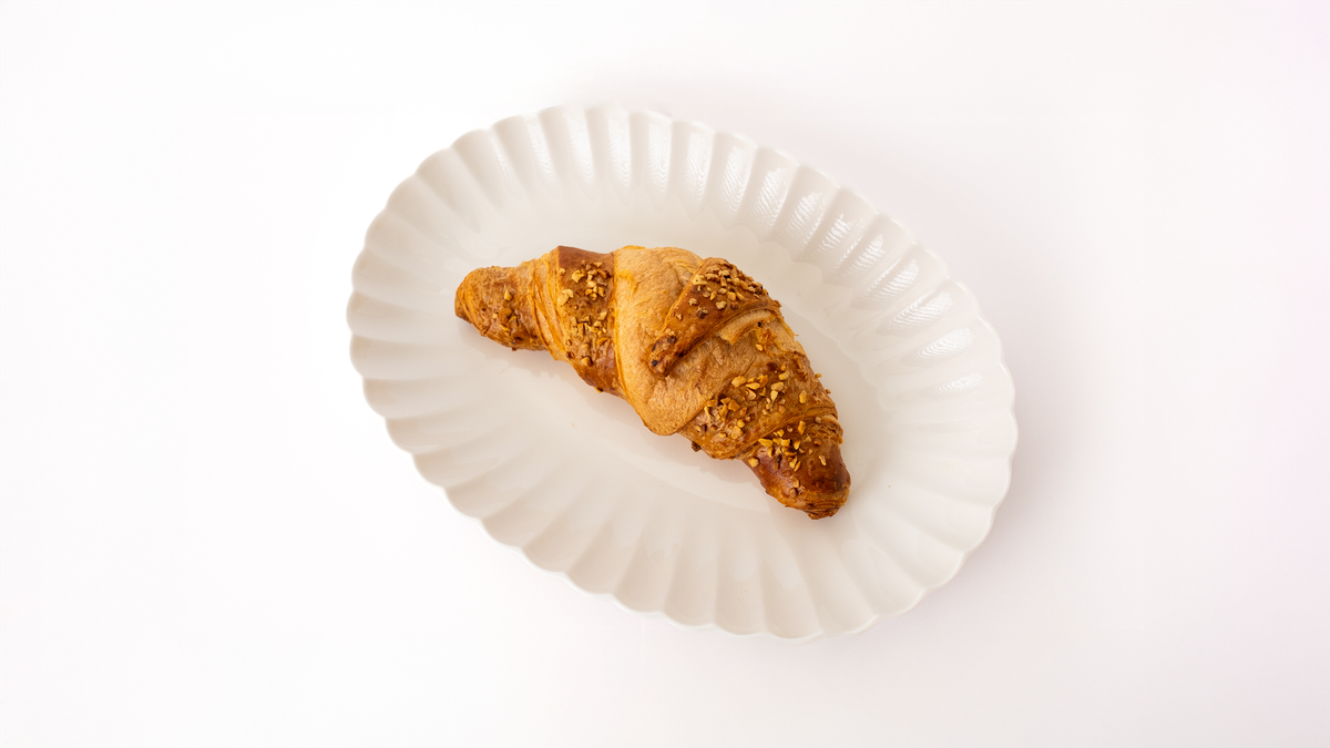 Croissant with milk chocolate filling and topped with crunchy nuts