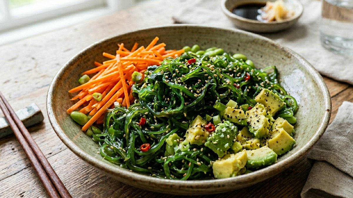 Seaweed Wakame, with fresh carrots, edamame beans, cucumber and avocado cubs.