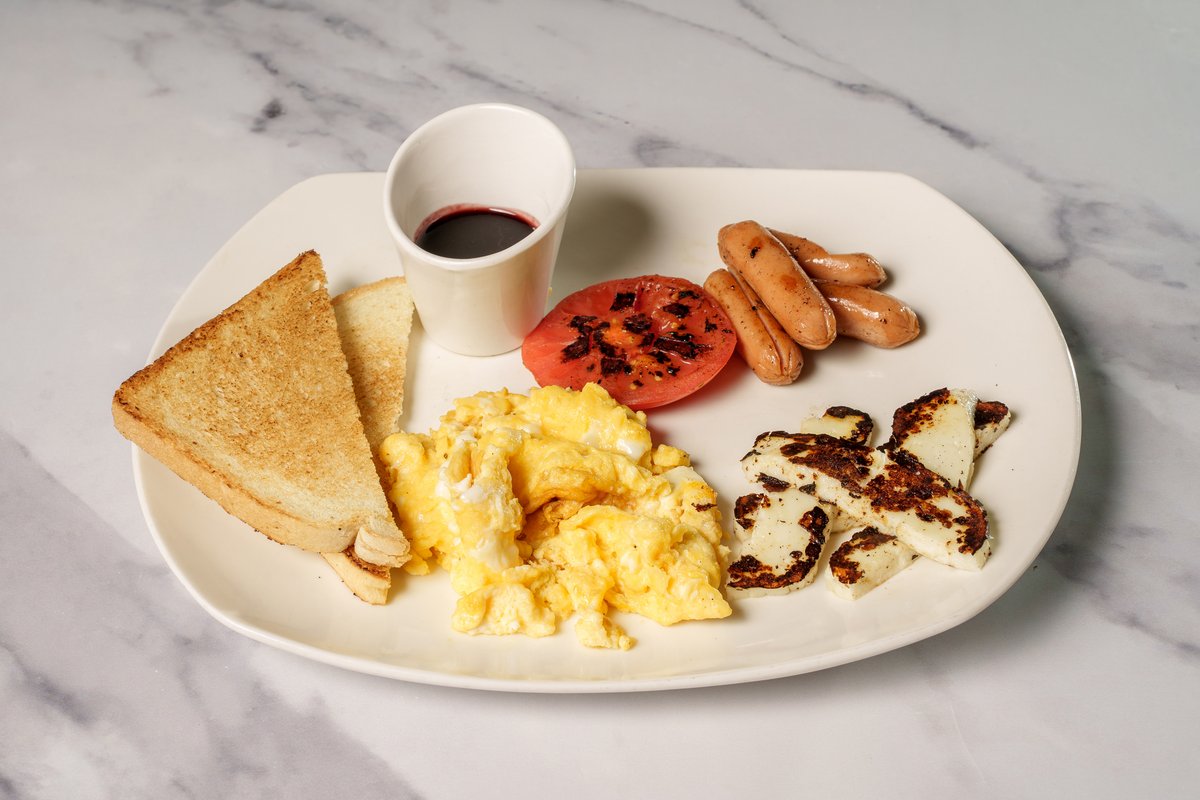 Eggs, Bacon, Cocktail Sausages, Halloumi, Mushroom, Grilled Tomato & Toast