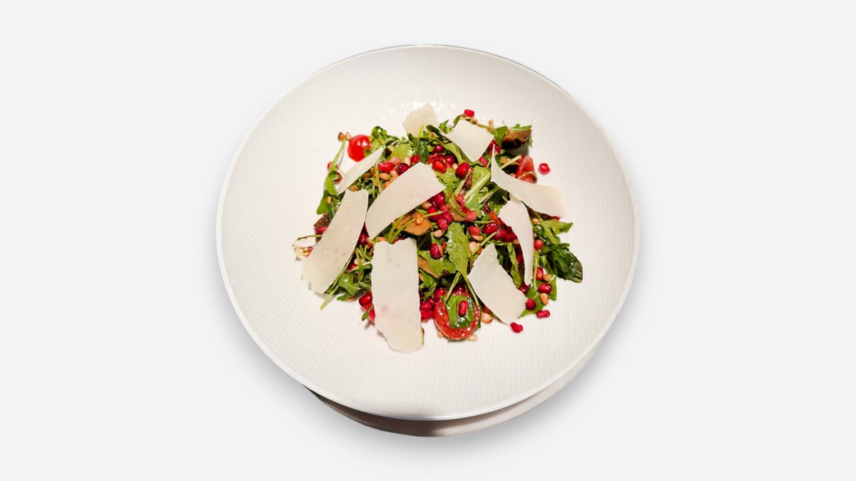 rocket salad, grilled vegetables, cherry tomatoes, pomegranate, pine nuts, parmesan, balsamic dressing