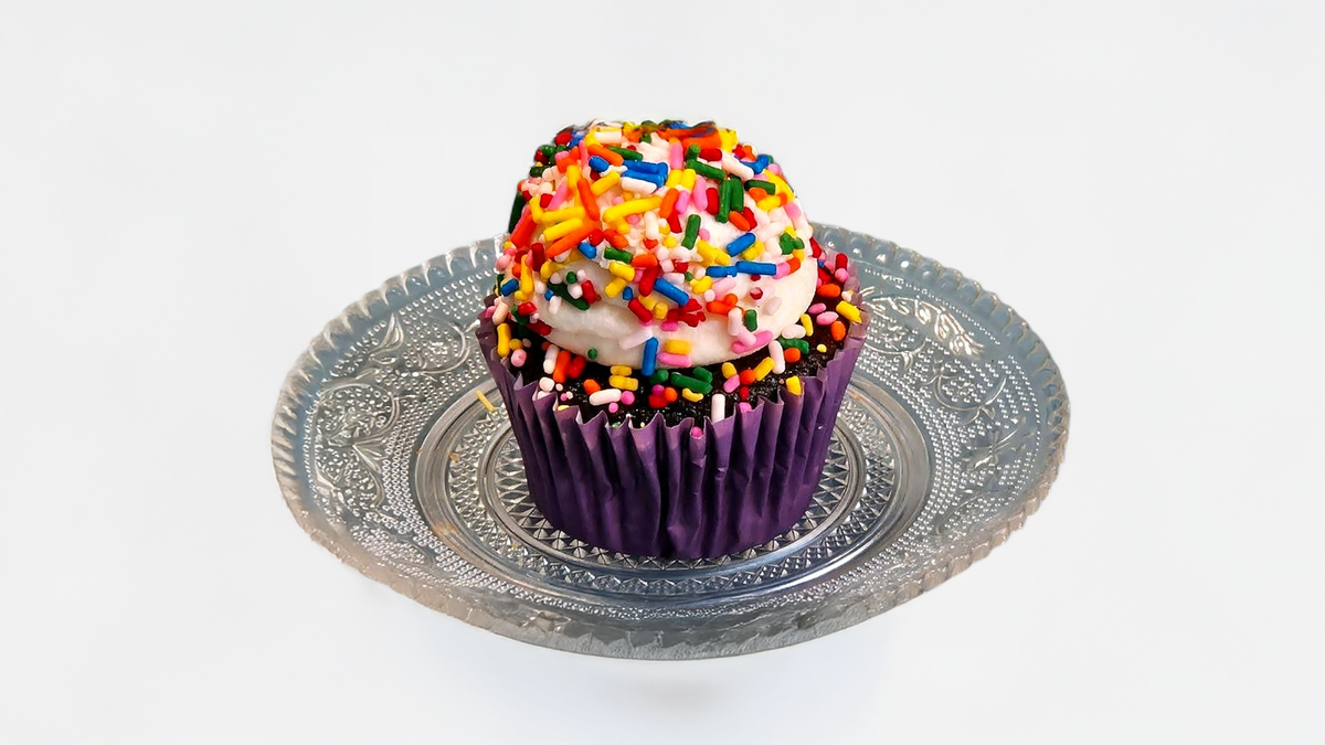 Chocolate cupcake Topped with vanilla frosting and sprinkles