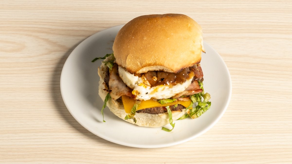 Beef burger 150gr, cheese, bacon, egg, caramelized onions, lettuce, tomato, ketchup
