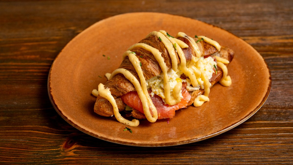 Butter croissant with smoked salmon, scrabbled eggs, fresh slice avocado and homemade hollandaise sauce