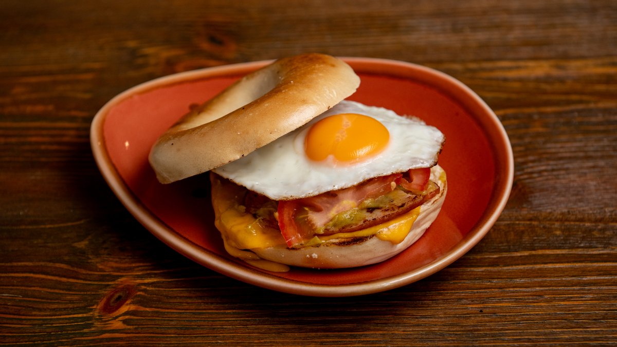 Bagel bread with homemade avocado sauce, smoked lutza, melted cheddar cheese, fresh tomato and fried egg
