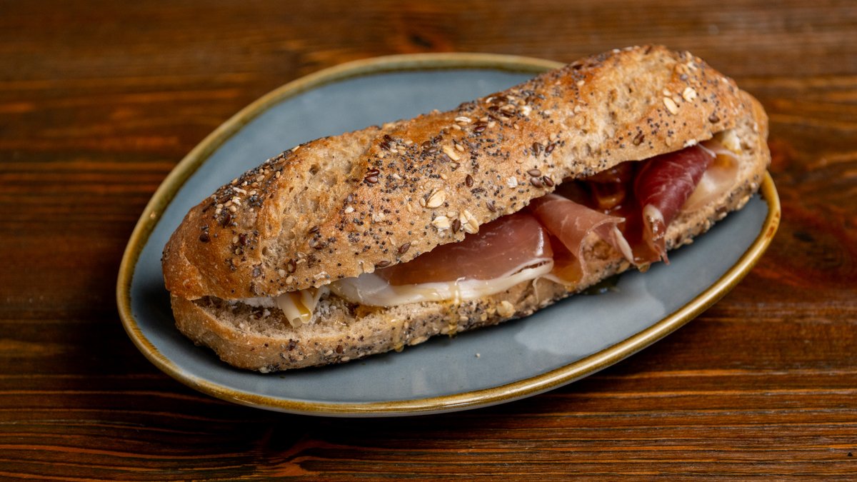 Black multi-seed baguette with slices of prosciutto, goat cheese, sun-dried figs, honey, and forest fruit jam.