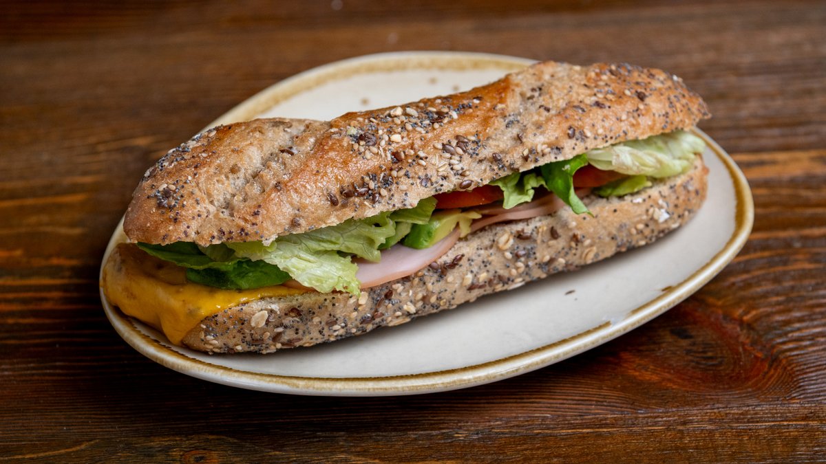 Black multi-seed baguette with slices of turkey, melted cheddar cheese, fresh slice of avocado, fresh lettuce and fresh tomato