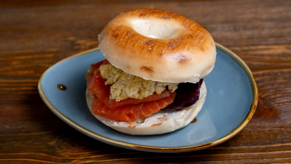 Bagel bread with smoked salmon, scrabble eggs, fresh avocado, fresh beetroot, cream cheese sauce and fresh lettuce
