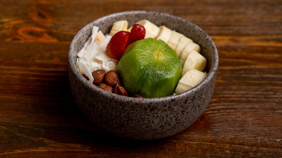 Low-fat yogurt with oat flakes, hazelnuts, coconut flakes, fresh bananas, fresh strawberries, and fresh kiwi. Honey or Maple syrup