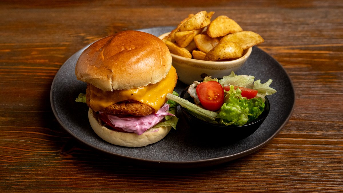 Fluffy bun bread with chicken pane, hashbrowns, melted cheese, fresh tomato, fresh mix salad and coleslaw salad. Served with wedges potatoes and fresh mix salad
