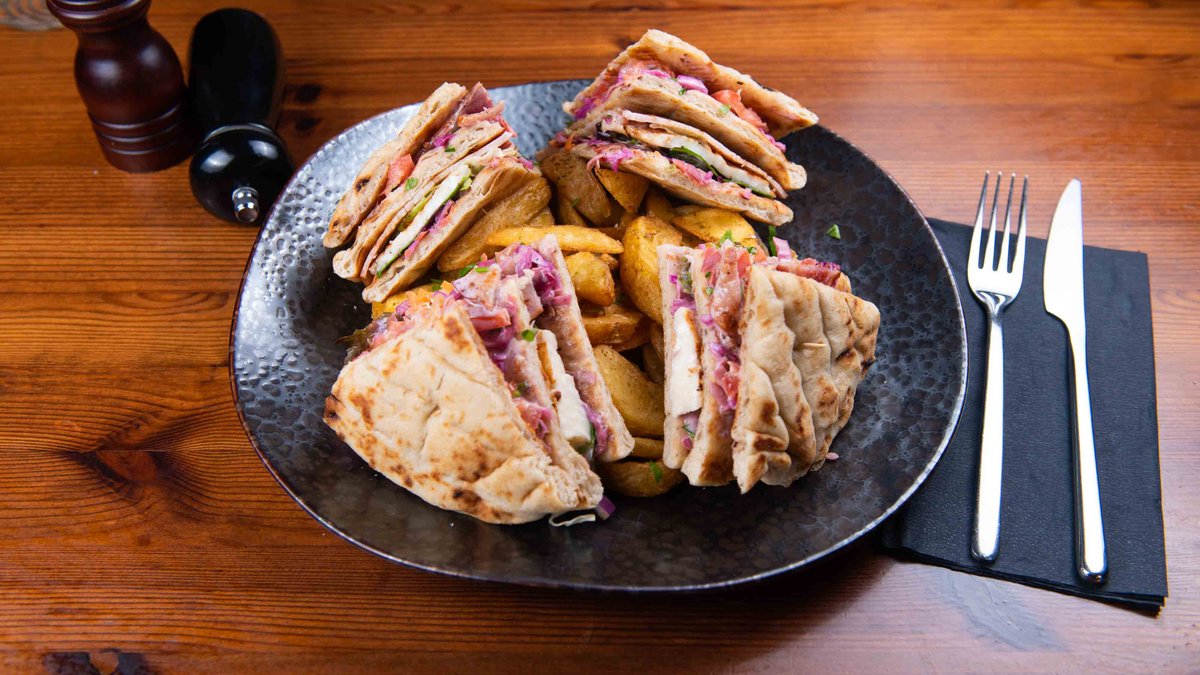 Triple Greek pitta with crispy bacon, lountza, grilled halloumi, fresh coleslaw salad, fresh tomato and fresh mix salad. Served with wedges potatoes