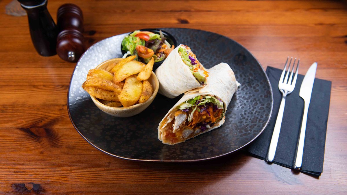 Tortilla with crispy chicken wrap, melted cheddar cheese, fresh tomato, fresh mix salad and mustard mayonnaise sauce. Served with wedges potatoes and fresh mix salad