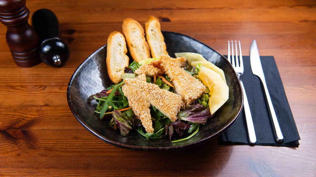 Fried halloumi with sesame, wild rocket, pieces of pastelaki, slice of melon, cucumber, sun dried tomato, fresh mix leaves and balsamic cream. Served with Greek pitta bread