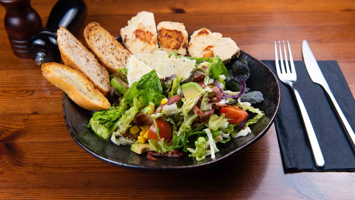 Grilled chicken with crispy bacon, fresh slice avocado, grilled corn, fresh mix leaves, cherry tomato, grated parmesan and vinaigrette basil . Served with Greek pitta bread