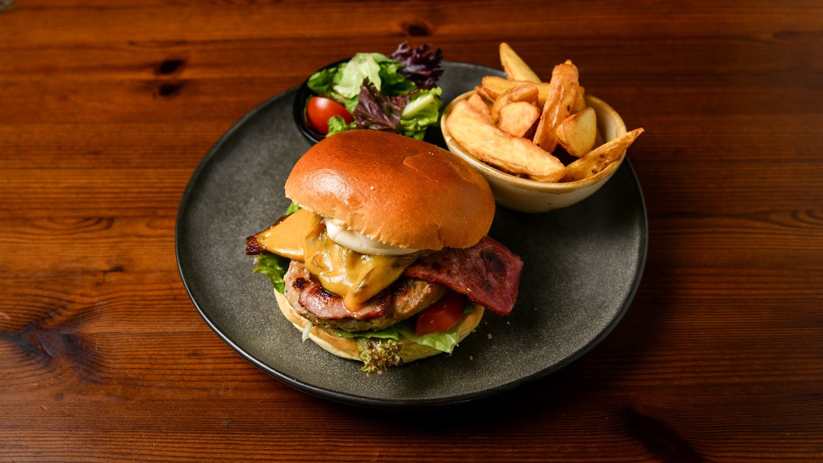 Fluffy bun bread with mix burger ( beef and pork ), caramelized onions with balsamic vinegar cream sauce, crispy bacon, melted cheddar cheese, fresh tomato, fresh mix salad and mayonnaise sauce