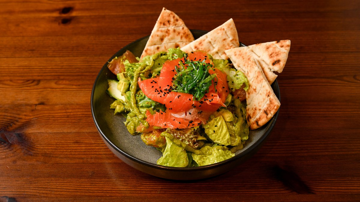 Bagel bread with sliced fresh avocado, smoked salmon, poached eggs, and homemade hollandaise sauce. Served with fresh mix salad, pomegranate, cherry tomatoes and fresh radish