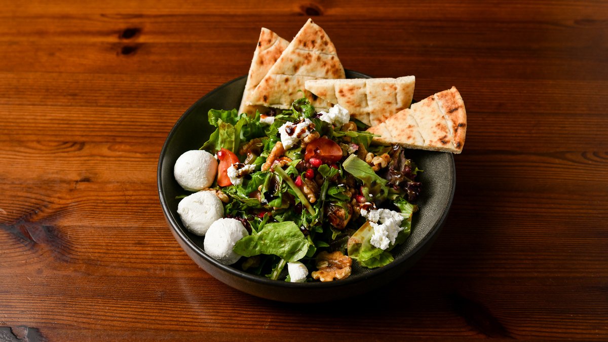 Mix fresh leaves with rocket, fresh cherry tomato, fresh pomegranate, walnuts, sun dried figs, goat cheese and balsamic fig cream. Served with greek pitta bread
