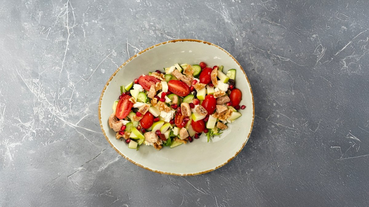 Savor our Greek Salad, a refreshing mix of juicy tomatoes, crisp cucumber, tangy olives, capers, crunchy green peppers, and creamy feta.