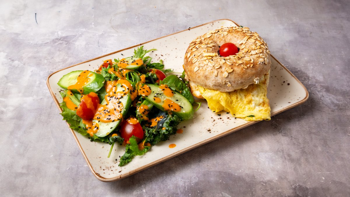 A mouth watering bagel with omelet filled with spinach, halloumi cheese and light tomato and avocado spread