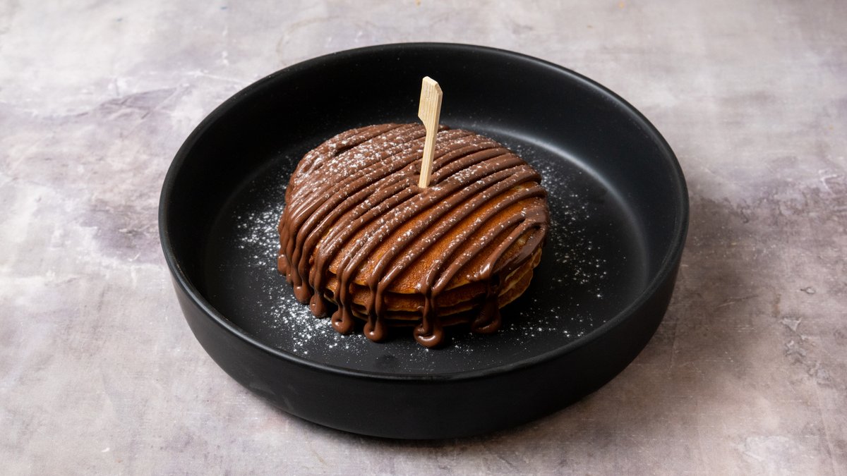 A tower of fluffy pancakes, topped with crispy bacon,edam cheese, cypriot Halloumi and maple syrup all over , finished with two Egg on the top. Salad on the side included.