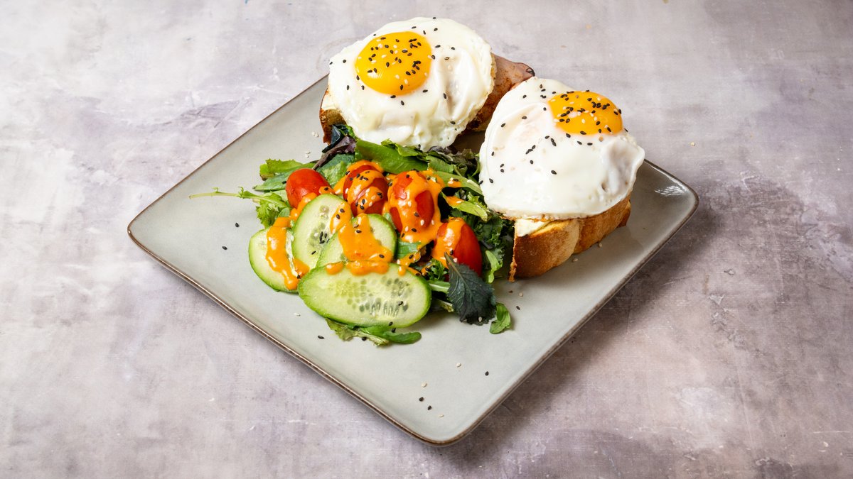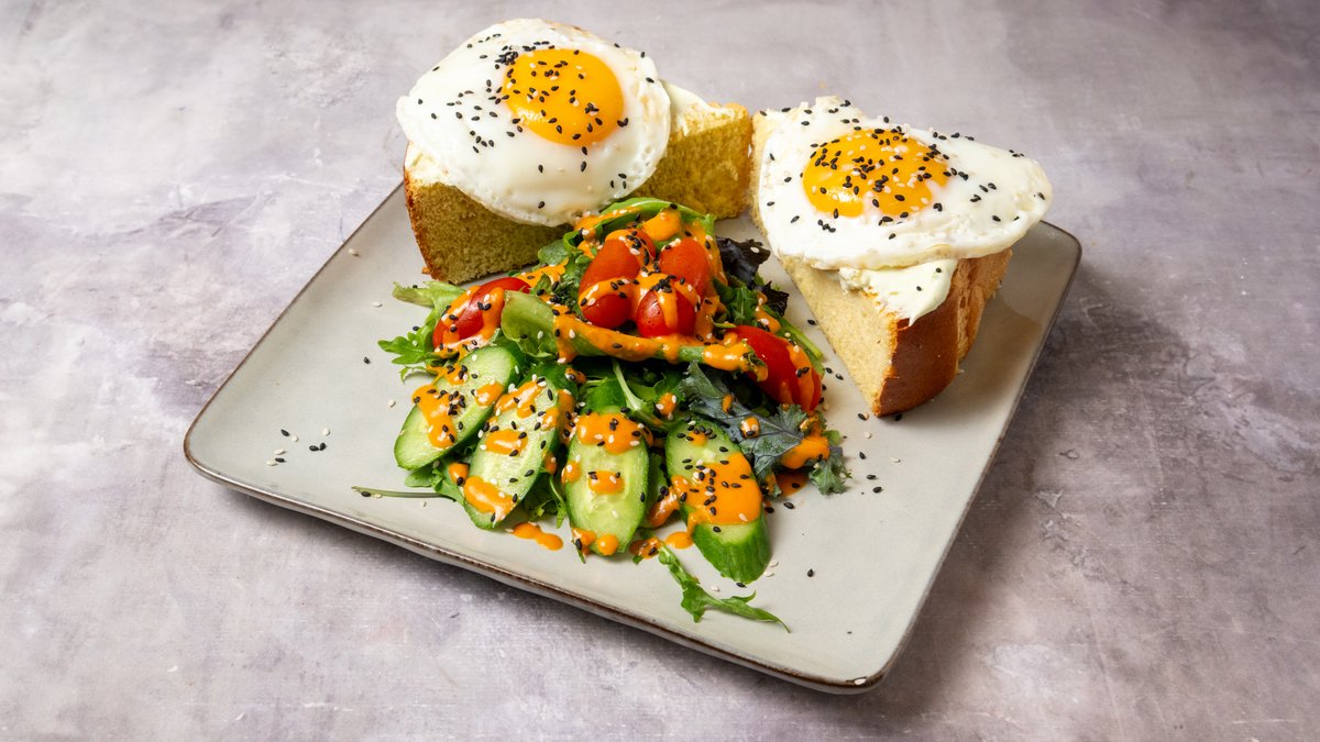 Brioche Avocado Stack Thick-cut toasted brioche layered with creamy smashed avocado, grilled halloumi and lountza, finished with perfectly cooked eggs. Rich, balanced and full of flavour with a salad on the side. A signature brunch classic.