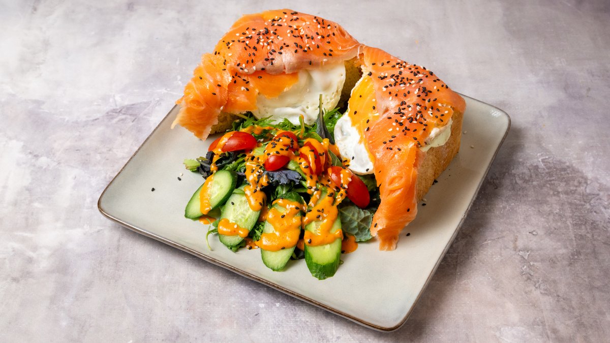Poppy seeds bagel with salmon and philadelphia, avocado and roccula