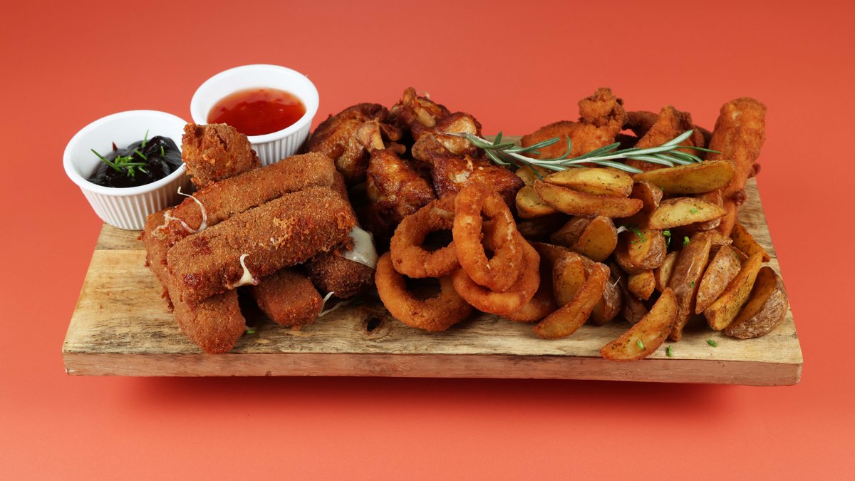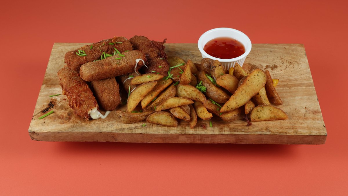 Mozzarella stick 5 pieces, onion rings 5 pieces, Bbq chicken wings 5 pieces, breaded chicken breast 4 pieces, potato wedges