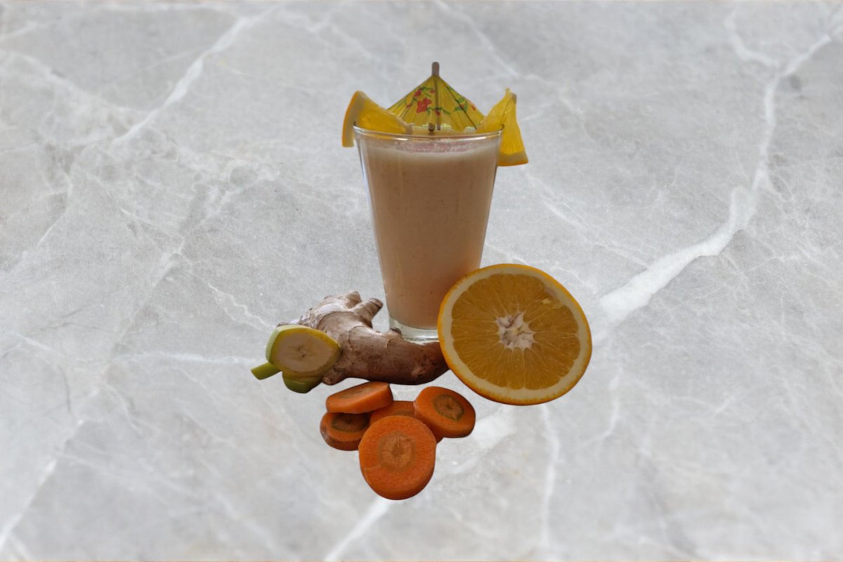 Contains fresh orange juice, carrot juice, banana, grated ginger & greek yoghurt