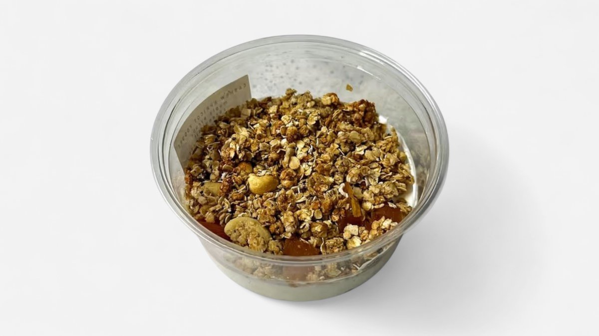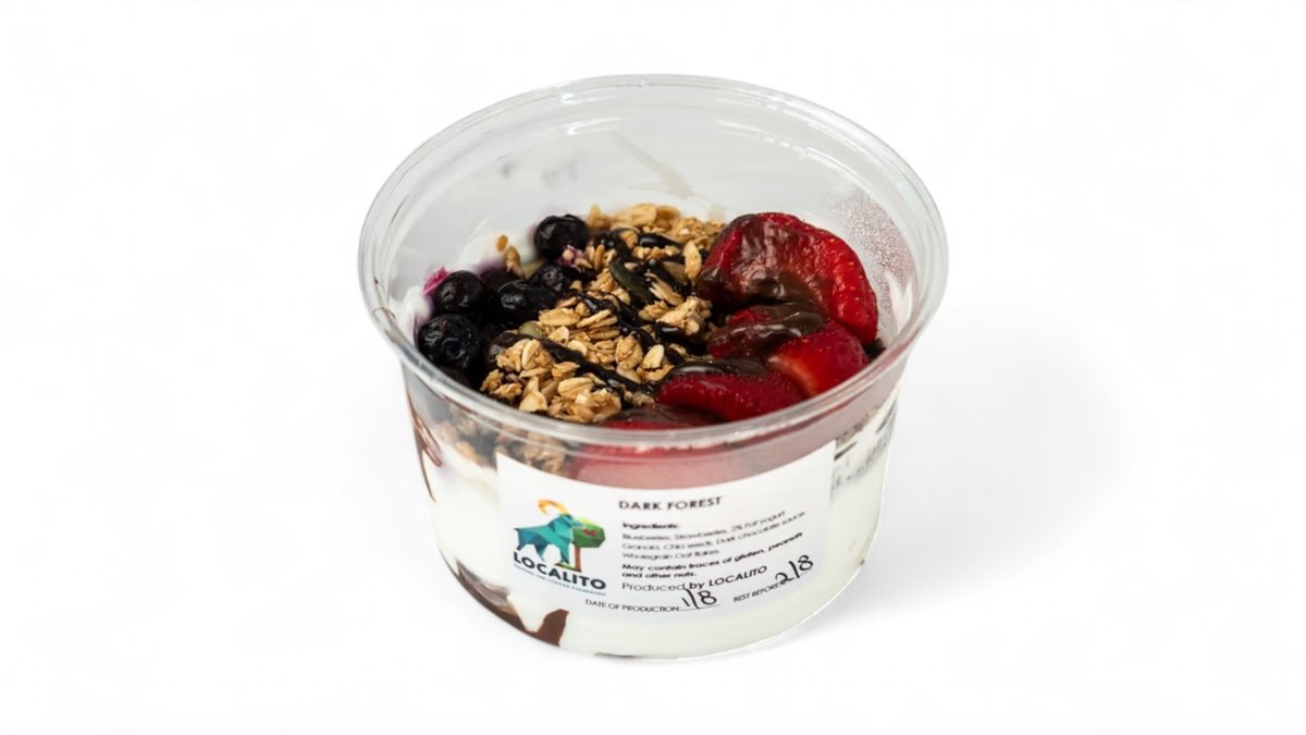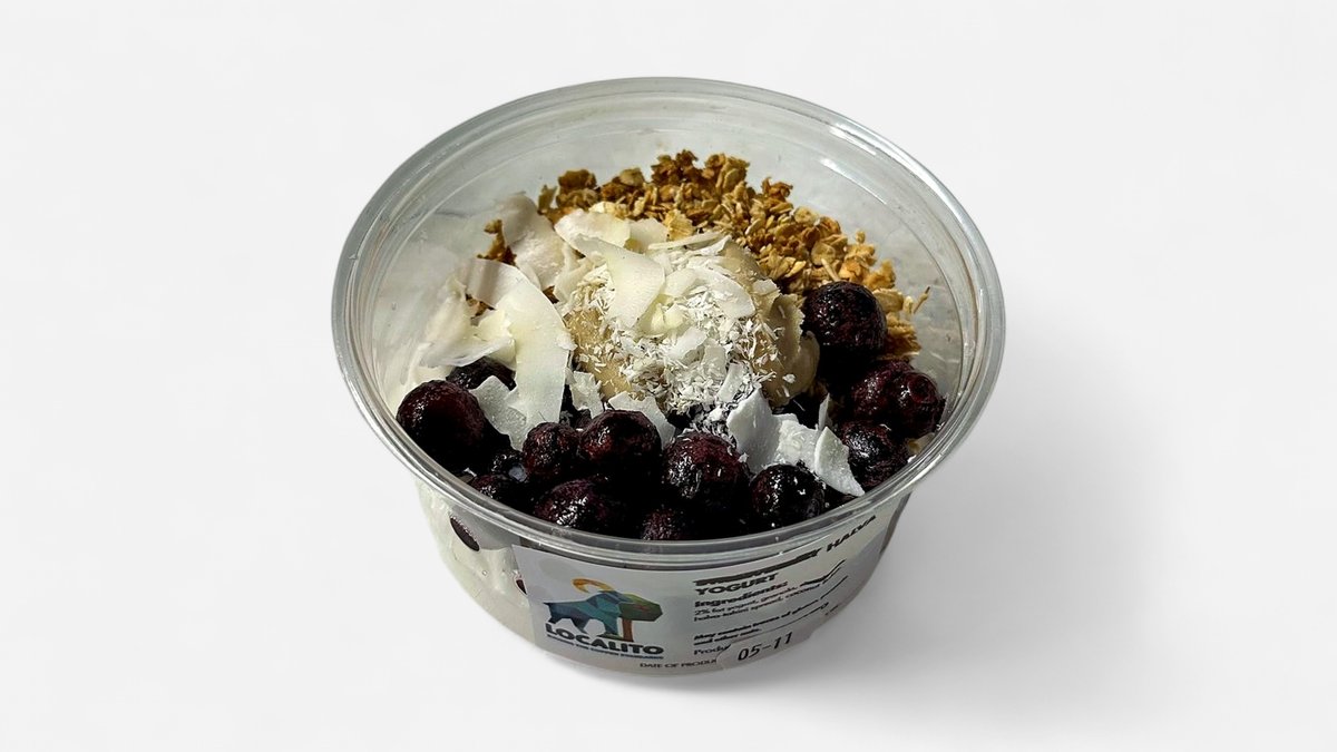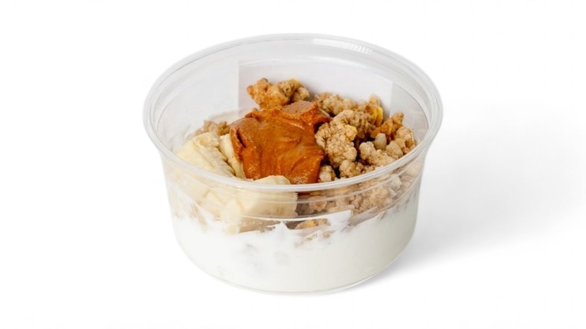 Delicious healthy yogurt 2% fat made with granola, banana, handmade peanut butter spread, maple syrup. May contain traces of soy, nuts, gluten.