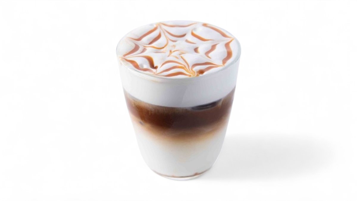 Fresh steamed milk, espresso, vanilla syrup, a thin layer of foamed milk and caramel sauce.