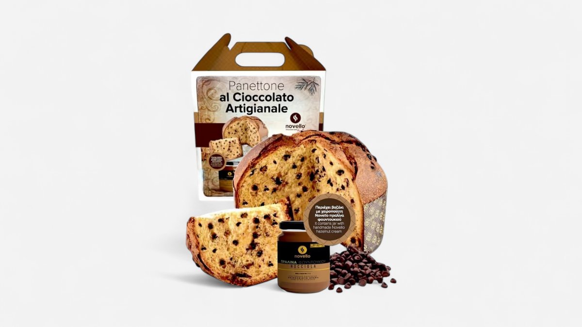 Κλασικό χειροποίητο χριστουγεννιάτικο Ιταλικό Panettone 750γρ. με κομμάτια μαύρης σοκολάτας. Μια παραδοσιακή συνταγή. Αφράτο και αρωματικό με κομμάτια μαύρης σοκολάτας και φυσικά αρώματα. Συνοδεύεται από χειροποίητη πραλίνα φουντουκιού Novello.