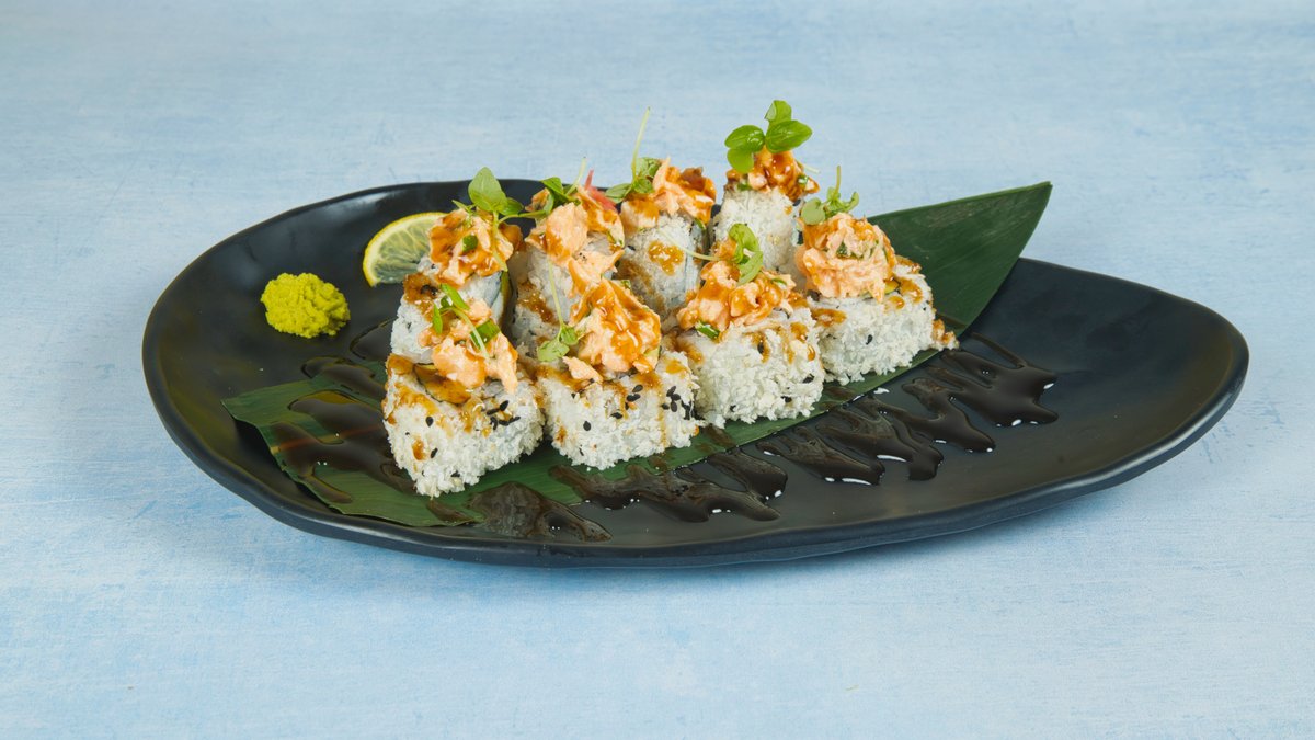Cooked seabass, avocado roll topped with spicy mayo cooked salmon and spring onion
