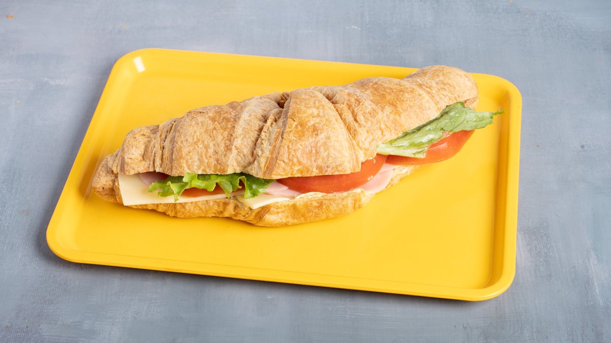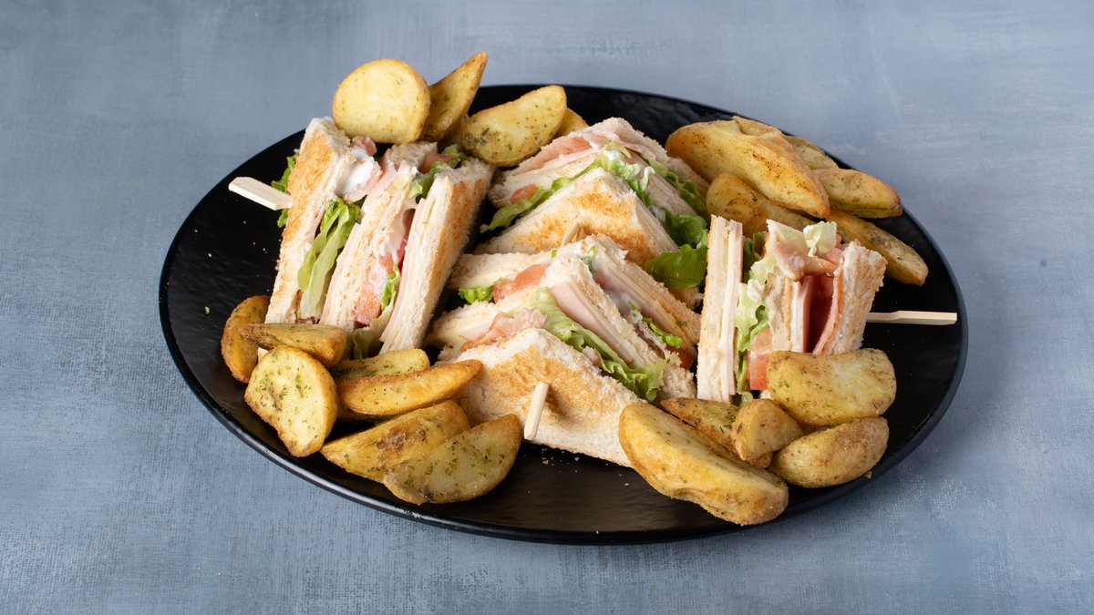 Ψωμί του τόστ με γαλοπούλα, Gouda, μπέικον, ντομάτα, μαρούλι και μαγιονέζα. Συνοδεύονται από πατάτες country