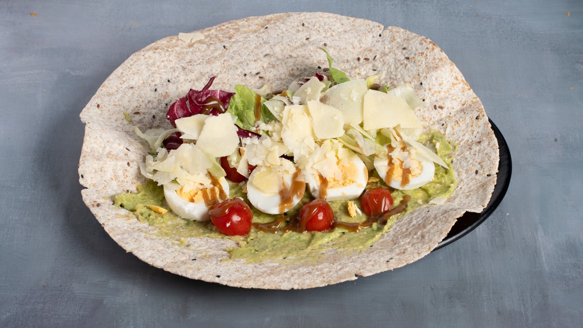 Ομελέτα τυλιγμένη σε τορτίγια με φιλέτο κοτόπουλο, Gouda, πατάτες τηγανητές, καλαμπόκι και ντοματίνια