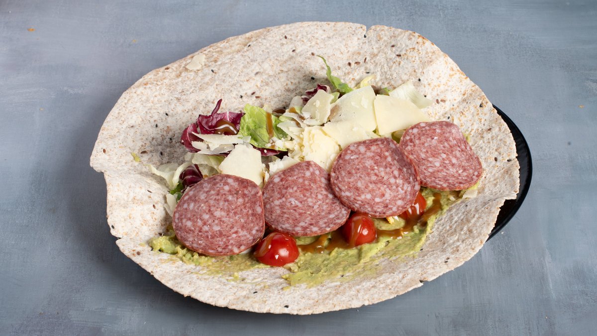 Ομελέτα τυλιγμένη σε τορτίγια με γαλοπούλα, Gouda, πατάτες τηγανητές και ντοματίνια