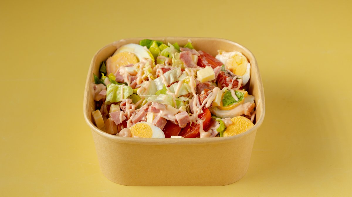 Μαρούλι, τυρί, ζαμπόν, αυγά, ντοματίνια, αγγούρι, μπέικον και sauce chef